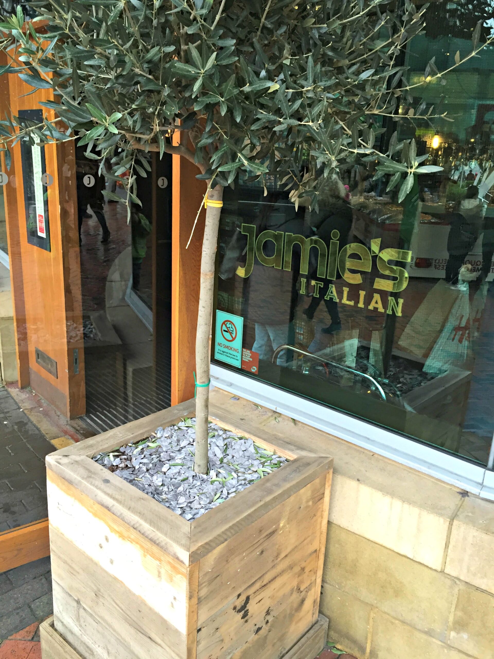 We were rather lucky to be invited to go for a meal at Jamie’s Italian in Reading. I have to confess that before we accepted we were already fans and have eaten there before. Located behind the Oracle Shopping centre, by the river, Jamie’s Italian is a modern glass faced building accessorised with olive trees and filled with Jamie’s merchandise galore.