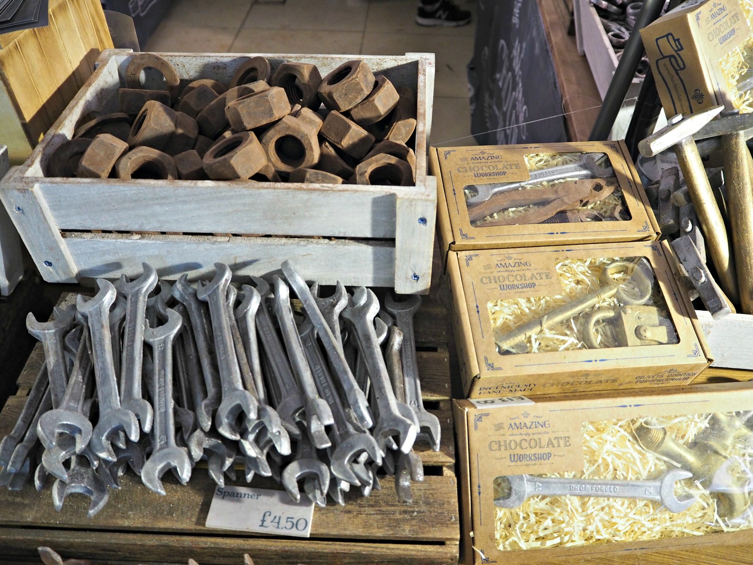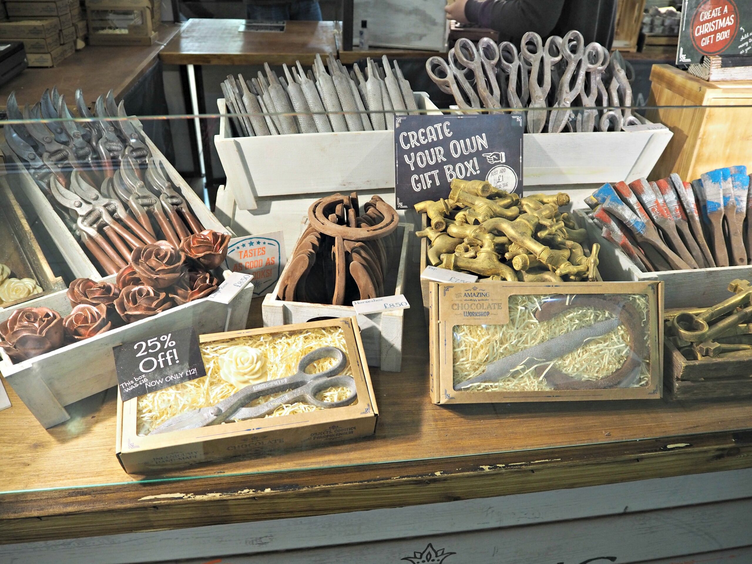 The centre had lots of Christmassy things going on. From a Santa’s Grotto and train, a full size snow globe which you could go in and have some fun Christmas photos taken with yourself inside the snow globe. I also had to share with you some pictures of this amazing chocolatier stand they had in the shopping centre. No these are not tools… they’re chocolate!