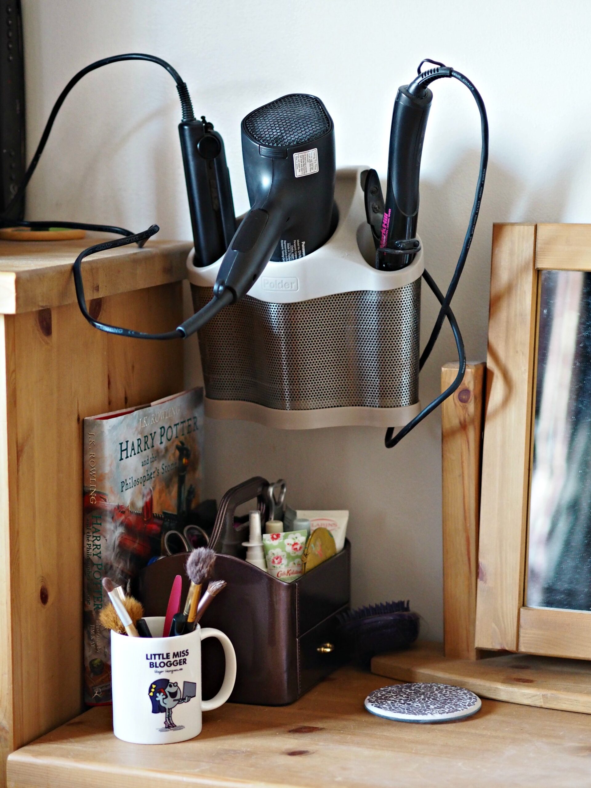 Then I used some organisation items to help me store things more effectively. Some of these things I had already bought, so I haven’t bought them all in one go. I have a necklace hanger on the wall for my long necklaces and a little heart craft Logan made me at pre-school, a Polder to store my hairdryer, tongs and straighteners as well as a Lakeland make-up caddy already for some of my make up bits.
