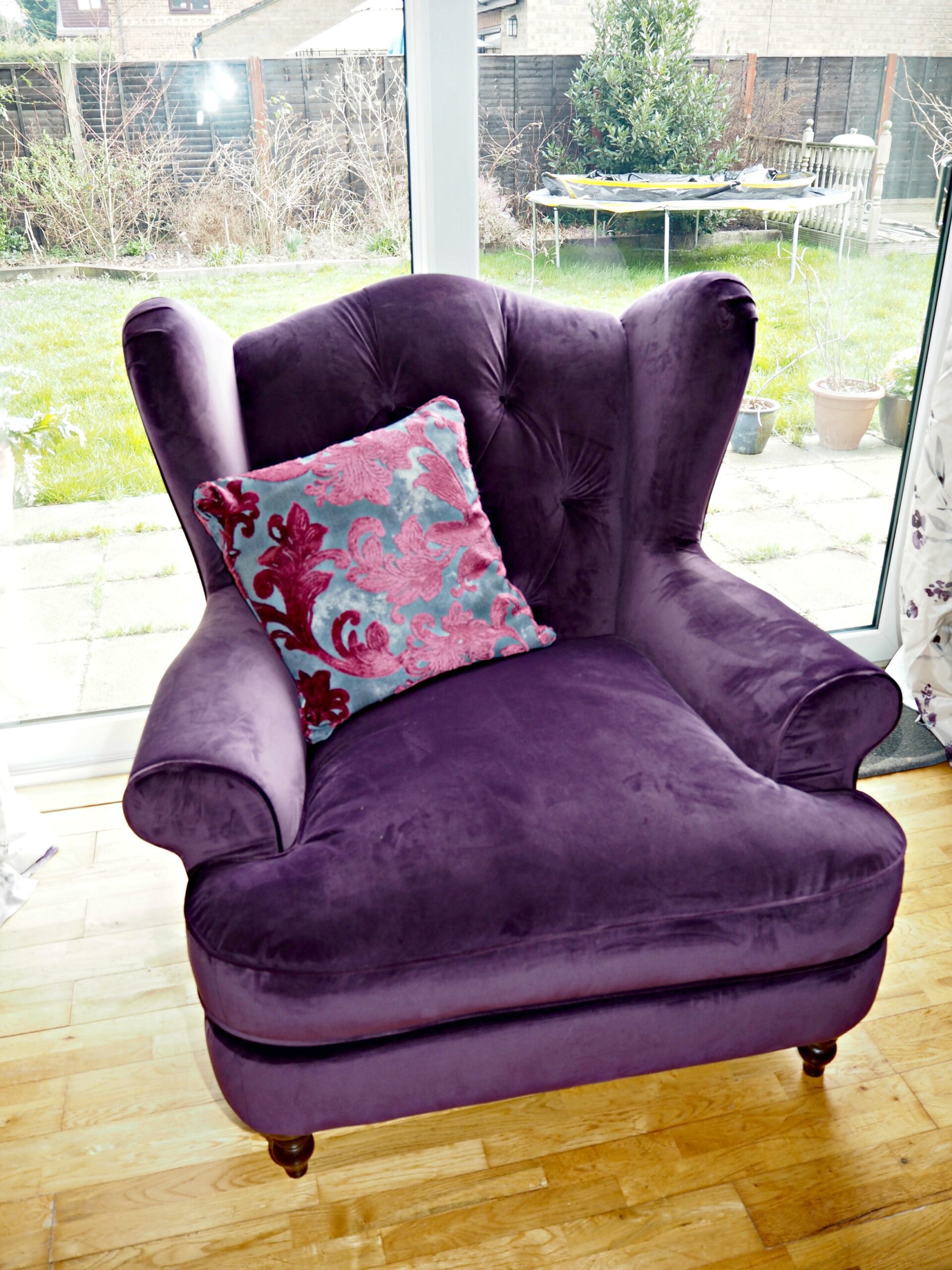 I absolutely love pink sofa, but after deliberation decided it would be too much for the room if the whole suite was in pink. So we decided on the just having the two seater sofa in pink as an accent and the rest of the suite in the rich dark purple. Which is a stunning colour. The sofas are so plump and comfy, we really noticed the different in comparison to the tired ones we used to have. I love all of the little details , like the vintage style legs, the multi-patterned cushions and the deep back and arms.